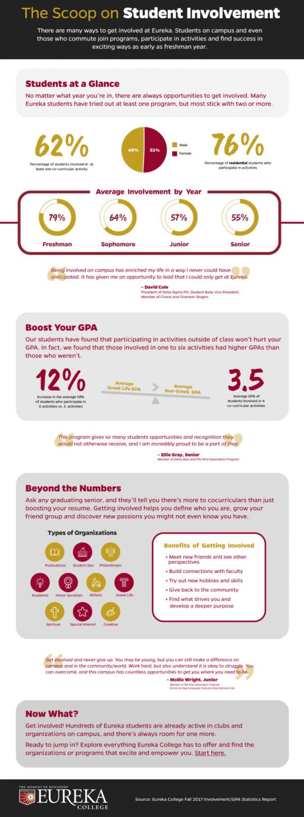 Whether you’ll be a returning student, a transfer student or an incoming freshman in the class of 2022 next fall, there is always a way to get involved at Eureka College. Check out the numbers on EC student involvement in our infographic below or download here.