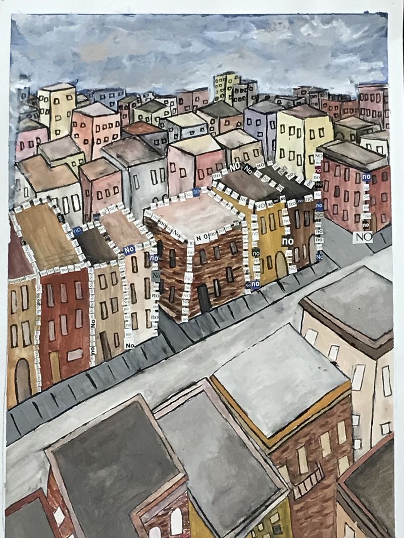 Her figurative paintings were created by using the gouache method and feature mixed media elements.