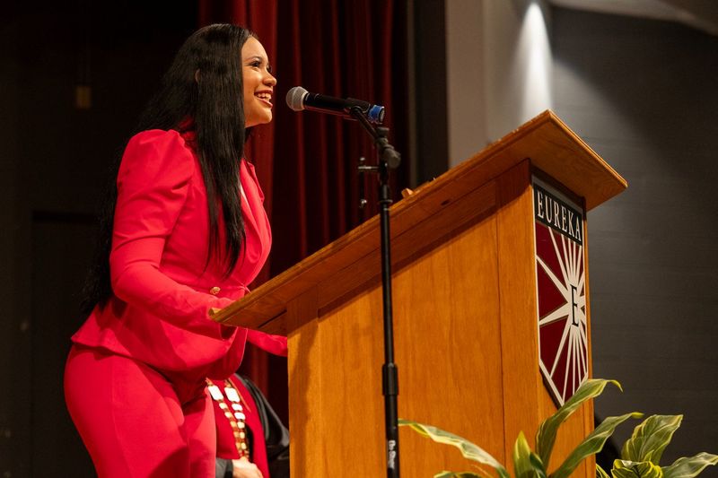 Wicks began by acknowledging her excitement and nerves as she addressed the student body, noting the honor of serving as Student Body President alongside Vice President Liv Hardin-Nieri. She highlighted one of Eureka’s long-standing traditions—comparing the college to an object in her opening remarks.