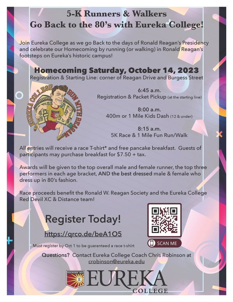EUREKA, Ill. – Get ready to step back in time and lace up your running shoes for the exciting "Run with Reagan 5K: Back to the 80's" event, hosted by Eureka College on Saturday, Oct. 14.