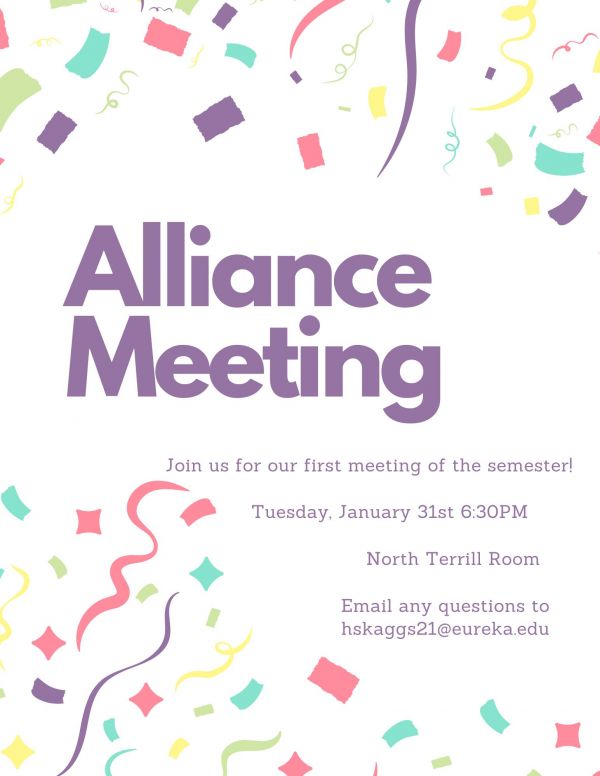 Join us for the first meeting of Alliance, this is a safe space for LGBTQ+ students and allies to meet together. Open to any and all people who would like to attend! If you have any questions, please email hskaggs21@eureka.edu.