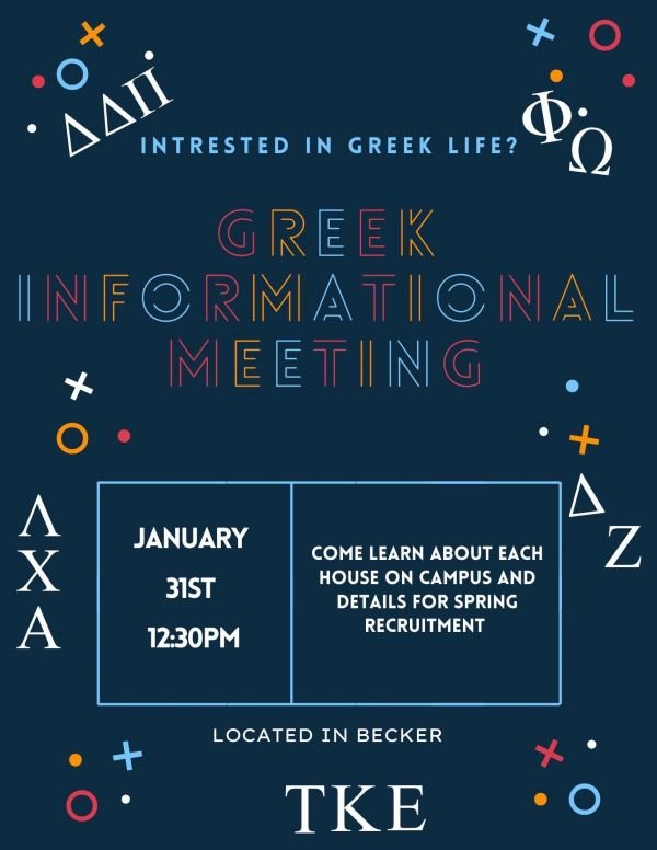 Greek Council will be hosting two Information Sessions about Formal Recruitment. The first session will be Tuesday, January 31st at 12:30pm in Becker Auditorium and the second session will be Friday, February 3rd at 5pm in the Terrill Rooms prior to the Carnival sponsored by Greek Life. You must attend one of the information sessions if you are interested in going through formal recruitment this semester. If you cannot make either session, please set up a meeting with Greek Advisor, Pammy Levinson at plevinson@eureka.edu to remain eligible for recruitment.