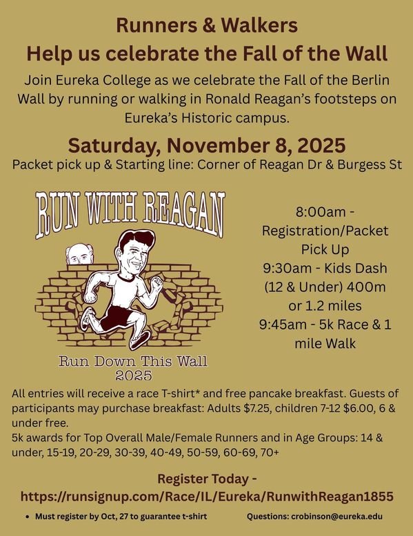 Join Eureka College on Saturday, November 8, 2025, as we celebrate the anniversary of the Fall of the Berlin Wall with our annual Run with Reagan event. Participants are invited to run or walk in Ronald Reagan’s footsteps across Eureka’s historic campus.