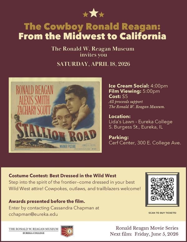 On Friday, April 18, we invite the public to campus for tHE Ronald Reagan Movie Series, featuring a screening of Stallion Road (1947). The evening will include ice cream, a “Best Dressed in the Wild West” costume contest, and an outdoor movie experience. Attendees are encouraged to bring blankets or lawn chairs for the screening.