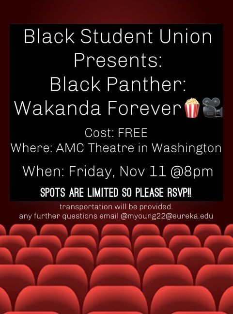 Black Student Union is sponsoring a trip to the movies (in Washington) to see Black Panther: Wakanda Forever November 11th at 8:00pm. Transportation is available (leaving campus at 7:30pm). Space is limited.