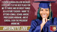... politics, Ronald Wilson Reagan attended Eureka College and graduated in 1932 after a prolific four-year stint of being involved in campus politics, athletics, theatre and Greek life. He once famously said of Eureka College, “Everything that has been good in my life began here.” And now this is the place where Love will begin the next phase of her life. “As a parent, nothing is more exciting than to see your child’s success be acknowledged. I’m ... books about President Reagan. Although Love’s choices were nearly unlimited, Eureka offered the opportunity to receive highly personalized attention on a small but historic college campus, and expand her funnel of experience in all of her areas of interest.