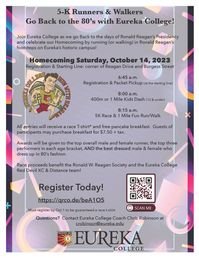 ... lace up your running shoes for the exciting "Run with Reagan 5K: Back to the 80's" event, hosted by ... for the exciting "Run with Reagan 5K: Back to the 80's" event, hosted by Eureka College on Saturday, Oct. ... exciting "Run with Reagan 5K: Back to the 80's" event, hosted by Eureka College on Saturday, Oct. 14. This thrilling ... a one-mile fun run/walk and 5K at 8:15 a.m. It is $25 to register for the 5K and ... causes: the Ronald W. Reagan Society and the Eureka College Red Devil Cross Country and Distance Team. “The team, coaches ... help host the Run with Reagan again during homecoming,” EC cross country coach and event chair Chris Robinson ... male and female runner, as well as the top three performers in each of the following age groups: 14 ... spot today, visit https://5kevents.raceentry.com/run-with-reagan/race-information. About Eureka College Located on nearly 70 wooded acres in Eureka, Illinois, and chartered in 1855,