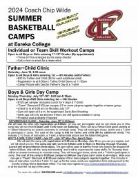 ... located behind the Reagan Athletic Complex. What should your camper bring? Cleats Shin guards Water bottle Gloves (for keepers) Lunch (lunch is not provided) What will your camper be learning? 9:30 - 10:00 - Check in 10:00 - 11:30 - Training Session 11:30 - 1:00 - Lunch and Talk/Player Demo 1:00 - 2:00 - Ladder Games 2:00 - 3:30 - Team Games 3:30 - 4:00 - Closing Remarks Click here to register. Questions? Contact Coach Woodside at: rwoodside@eureka.edu